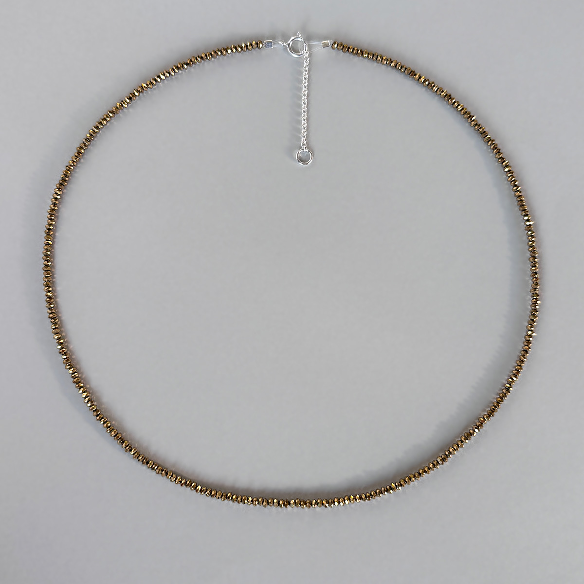 200 leiAdaugă în coșArgint 925, pirita (piatra semipretioasa) Dimensiuni: colier – 38.5 cm + 3 cm (extensie), pietre - 2x3 mm Proiectat si produs in studioul SOUL- Bucuresti Ambalaj inclus Livrare în România…