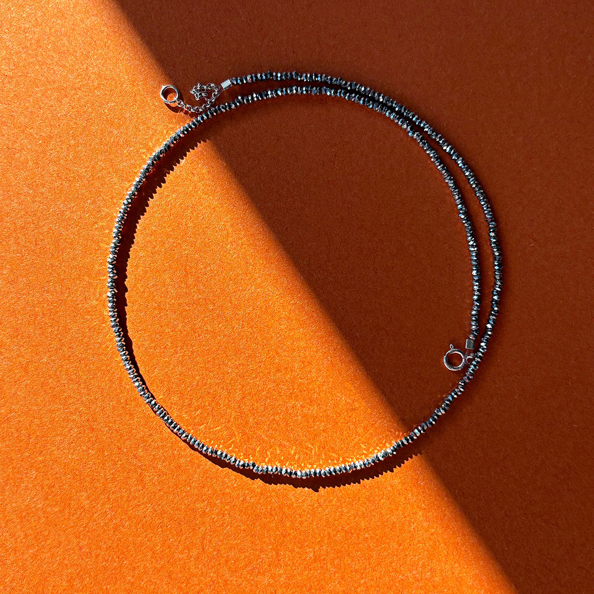 Argint 925, hematit (piatra semipretioasa) Dimensiuni: colier – 38 cm + 3 cm (extensie), pietre - 2 mm Proiectat si produs in studioul SOUL- Bucuresti Ambalaj inclus Livrare în România…