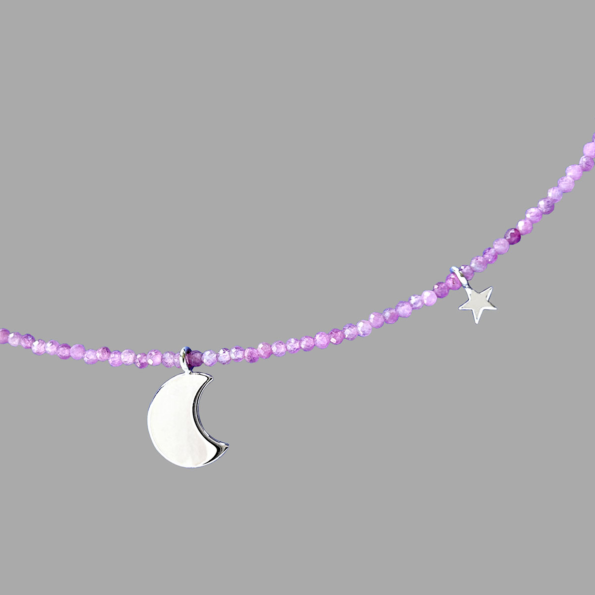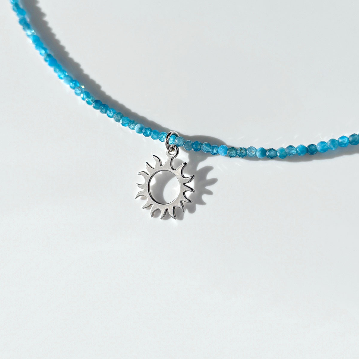 Argint 925, piatra soarelui bleumarin (piatra semipretioasa) Dimensiuni: colier - 40 cm + 3 cm (extensie), diametru pietre - 2 mm, stea Proiectat si produs in studioul SOUL - Bucuresti…