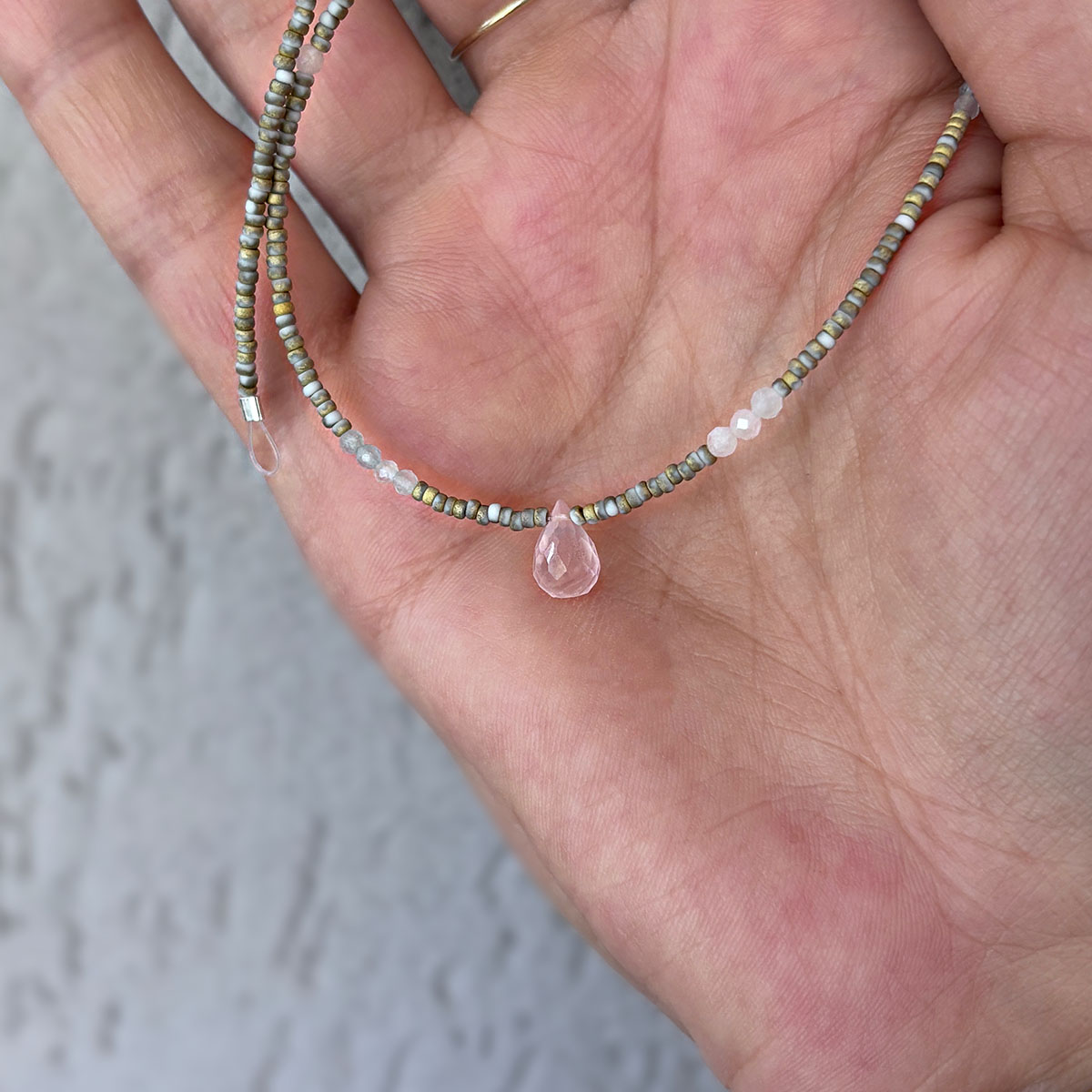 Argint 925, quarz roz (piatra semipretioasa), perle de sticla miyuki, acvamarin (piatra semipretioasa), morganit (piatra semipretioasa) Dimensiuni: colier – 39 cm Proiectat si produs in studioul SOUL- Bucuresti Ambalaj inclus…