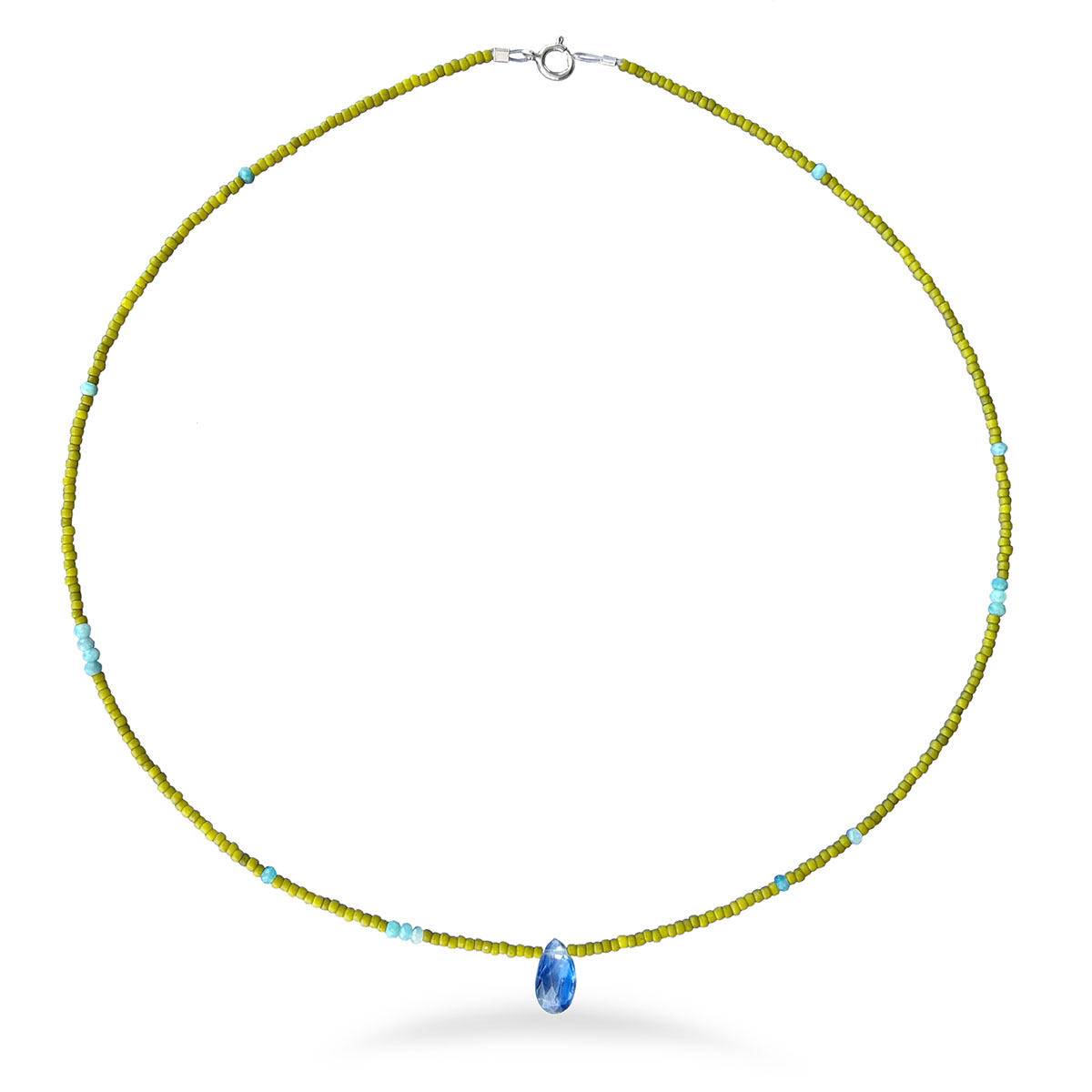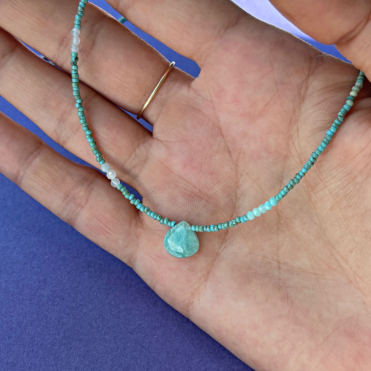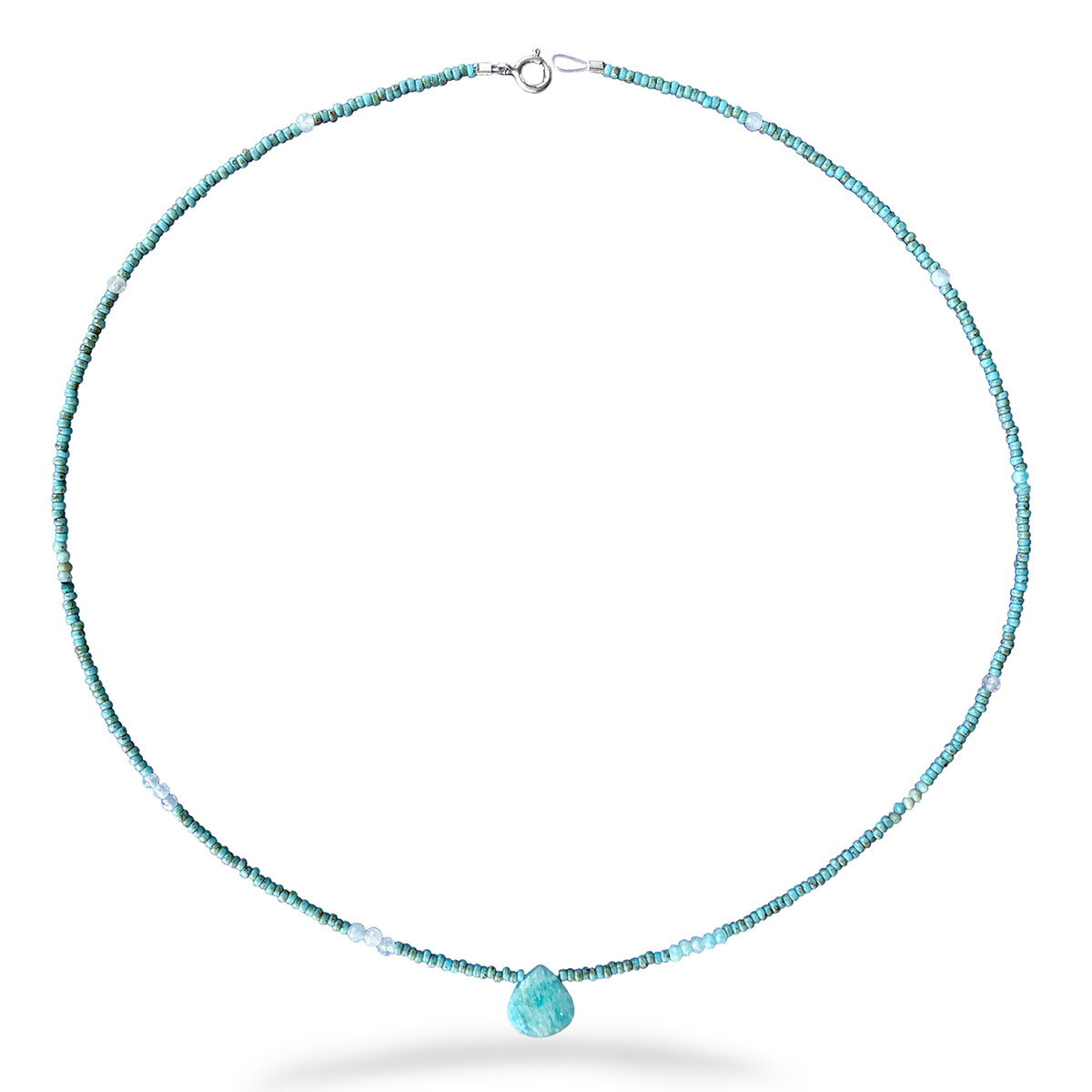 Argint 925, kianit (piatra semipretioasa), amazonit (piatra semipretioasa), perle de sticla miyuki Dimensiuni: colier – 39 cm, pandantiv - 9 mm Proiectat si produs in studioul SOUL- Bucuresti Ambalaj inclus…